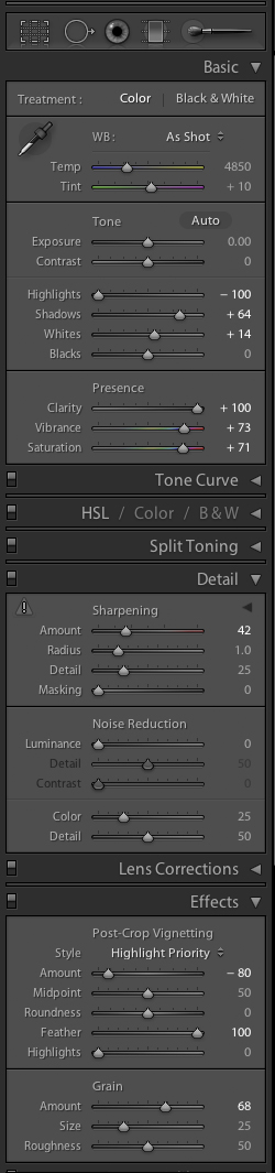 I want to add two items that don’t show on the screenshot of the Develop Panel above: Lens Corrections and Camera Calibration. I set my lens corrections so any distortions are removed and my camera calibration is always set to neutral so I am always working on a base RAW image without interpretation from Canon’s Picture Styles.